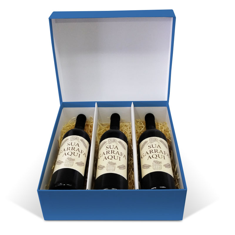 - A caixa pode ser personalizada internamente com palha decorativa, disponível nas cores madeira natural, laranja, marrom, vermelha, rosa, verde, amarela e azul, para valorizar o visual interno da caixa e dar um toque único às suas garrafas.