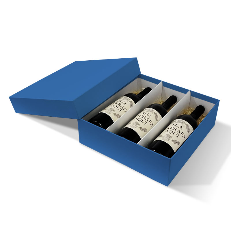 A Caixa Cartonada Tampa e Fundo para Três Garrafas! Com divisórias internas que protegem cada garrafa com segurança e um elegante revestimento  na cor Toronto, essa embalagem é perfeita para transformar suas bebidas em presentes de alto impacto. Sofisticação, resistência e charme reunidos em um design que valoriza cada detalhe. Ideal para impressionar em qualquer ocasião especial.