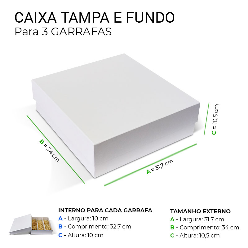 - Dimensões Externas: Largura 31,5 cm x Comprimento 34 cm x Altura 10,5 cm- Dimensões Internas para GarrafasLargura 10 cm x Comprimento 32,7 cm x Altura 10 cm- CapacidadeAdequada para três garrafas de vinho, espumantes ou bebidas similares